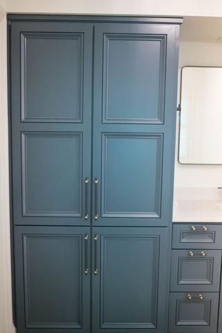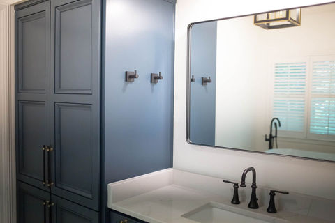 This was a complete primary bath remodel. The beautiful, natural travertine floors are warm to the touch with its built-in radiant floor heat system. The his and hers vanities are all new doors and drawers with upgraded cabinet hardware. The primary shower was increased to a 5′ x 5′ shower with curbless entry and a custom shampoo niche with marble shelves. The freestanding tub and tub filler was added to the space below the windows, and all new lighting was installed to add fresh light and elegance in the space.