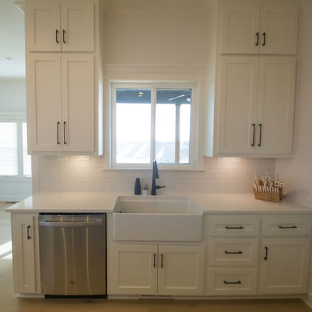 A new white oak hood was exactly what the designer ordered to create a focal point on the back stove wall of the kitchen; there had been two wall cabinets on either side of an elaborate hood over the range, however the hood was too traditional and the cabinets were too small to be well-utilized. We determined alongside the client that removing the cabinets had little effect on their overall storage, but the ultimate effect on the kitchen overall. The hood was meticulously crafted to be proportional to the wall it was featured on. Tile backsplash was replaced on the fridge and sink wall in Brickstone white and we used the same tile but in a herringbone pattern to create an eye-catching backdrop for our custom-built hood. To complete the kitchen facelift countertops were updated to a resilient quartz, and the island was rebuilt in a streamlined and matching shaker profile with updated features like a double trash pull-out and Blumotion soft-close drawers.