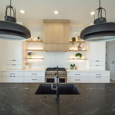 An artful inversion of countertop materials introduces striking contrast and visual rhythm. The island is topped with a dark, honed stone featuring ghost-like veining, grounding the room with rich depth. Perimeter countertops offer a lighter surface with soft, dark veining, creating an elegant interplay. A meticulously crafted white oak hood adds just the right amount of detail—introducing natural texture and warmth that softens and elevates the entire space.
