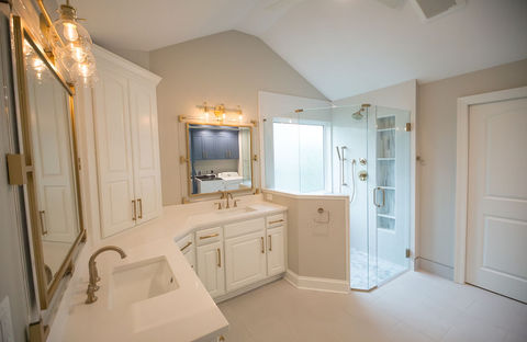 The homeowners really enjoyed their existing vanity layout and storage, so we had our team refinish these cabinets in Alabaster, and in updating the countertops, tile, and fixtures we have created a timeless design they can enjoy for years to come.
