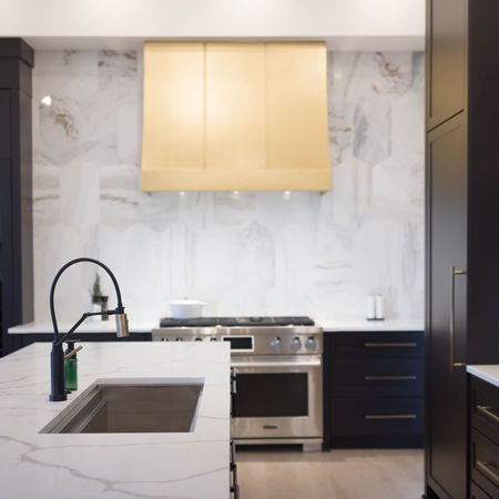The open kitchen and living room is really where the wow factor came in. The focal point of this kitchen is the large island backdropped by the dramatic black cabinetry. Behind the cabinet doors you will find the appliances taking the impact of the stainless steel appliances and putting it more on the overall design of the kitchen. The brass hood is really the show stopper of this whole project and really the main impact of the space.