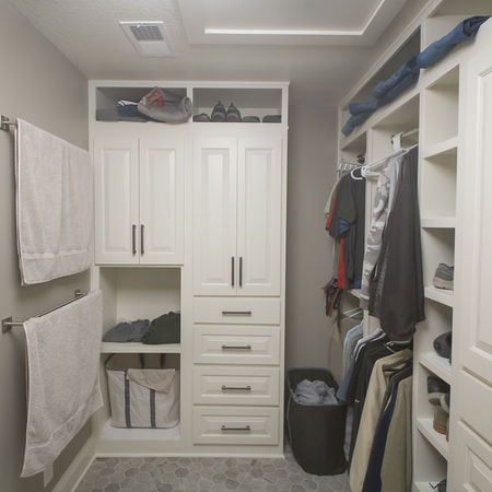 In this phase we reimagined a full primary suite, remodeling both the bedroom and bathroom. Reconfiguring and taking space from the oversized master bedroom and unused hallway we were able to gain a ton of usable space in the bathroom and closet. We blended new construction with the existing closet built-ins seamlessly carrying the home’s past into its future.