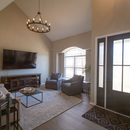 Our vision begins with a new front door and flooring. A wide plank flooring in carmel tones provides the perfect foothold for our rustic modern design. Replacing the front door serves as both a functional upgrade and a strong visual statement. Swapping out a dated or generic entry for a custom-crafted door instantly elevates curb appeal while setting the tone for the entire interior experience.