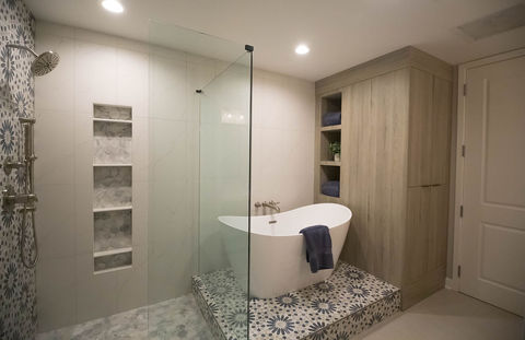 In the primary bath, what was once a confined and segmented space became an open, calming retreat. Removing the oversized tub deck and spa tub allowed the room to breathe, revealing new opportunities for flow and balance. When existing copper supply lines couldn’t be moved, we embraced the challenge by designing a sculptural step platform that connects the freestanding tub to the shower’s accent wall. The effect is both practical and artistic, creating a quiet focal point that anchors the space. Floating vanities, integrated storage, and gentle, well-placed lighting keep the room feeling bright, airy, and restorative.