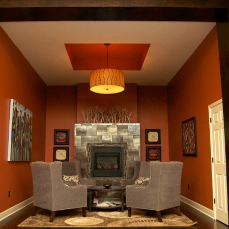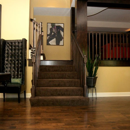This was a unique project in that the basement was a two tiered basement. This allowed for some creative thinking on how to incorporate a dramatic bar alongside a cozy theater area.